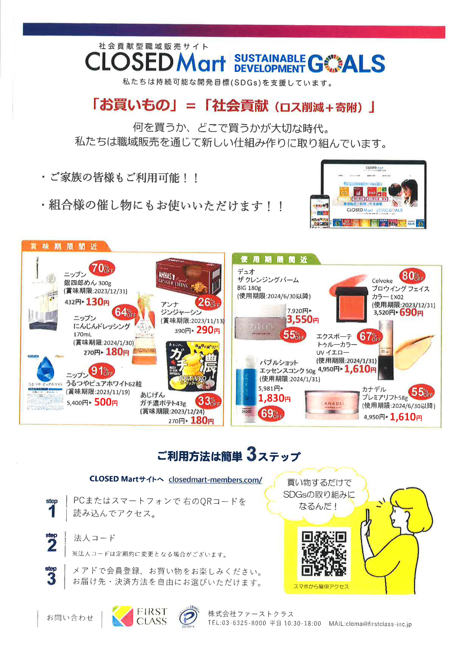 クローズドマートは、会員企業・団体の従業員の方々を対象に多様な商品・サービスを取り扱う、職域販売限定ECサイトです。